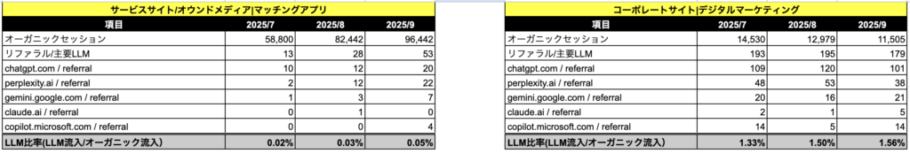 上記の画像はクーミルが管理するサイトへのLLM経由の流入数となります。このような形で月次でレポーティングすることでどのLLMから流入数が増えているか確認することができます。
