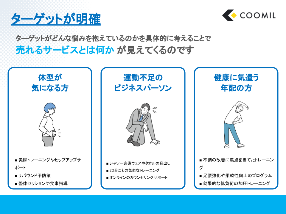 また、時代の変化に対応する柔軟性も重要です。新型コロナウイルス流行時には、密を避けたいというニーズが高まりました。ターゲットのニーズを理解し、それに合ったサービスを提供する姿勢が求められます。