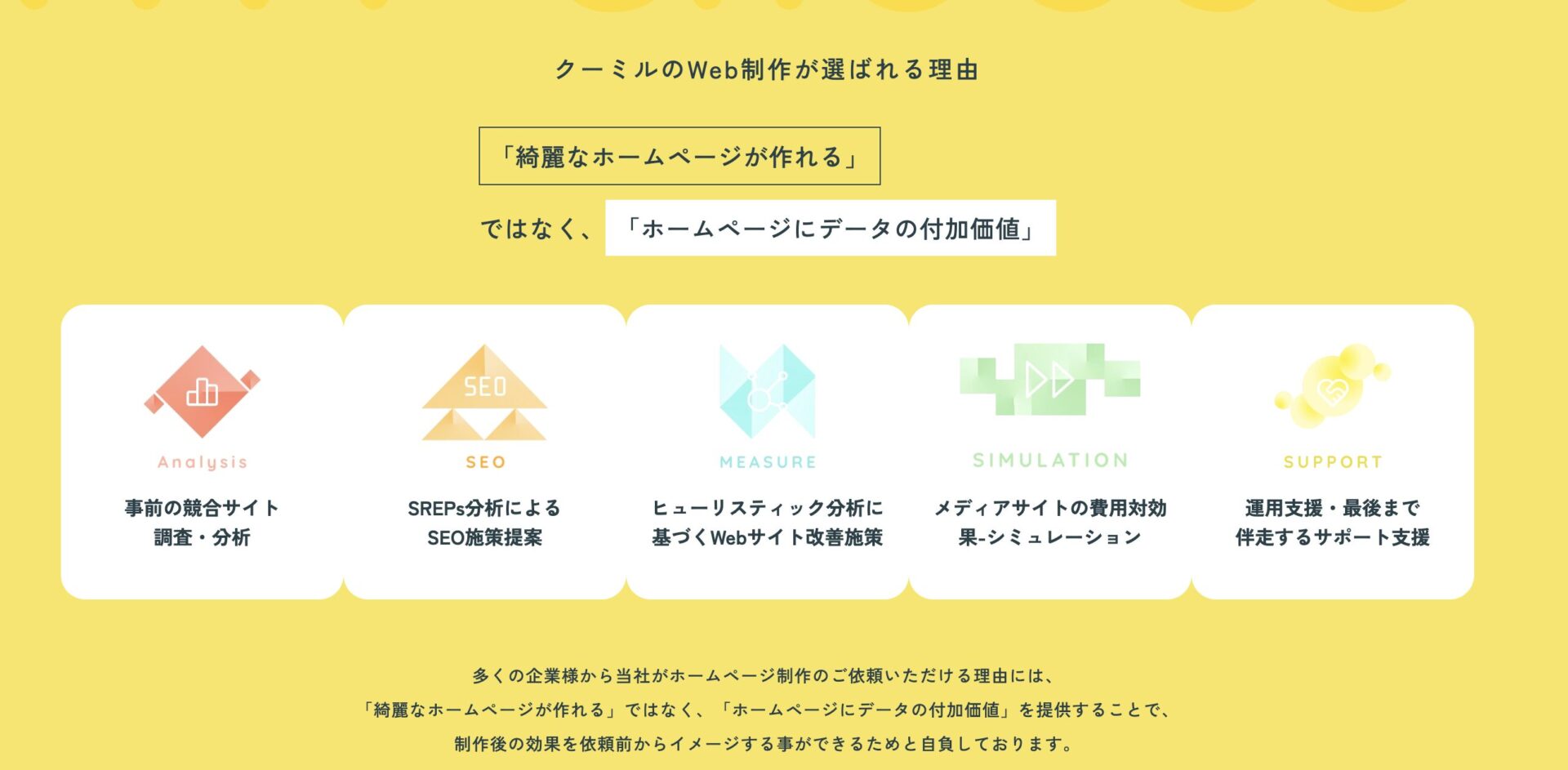 特に集客できるホームページを作る場合は、内部SEO構造および、その後の運用まで支援することができるWeb制作会社がおすすめとなります。
