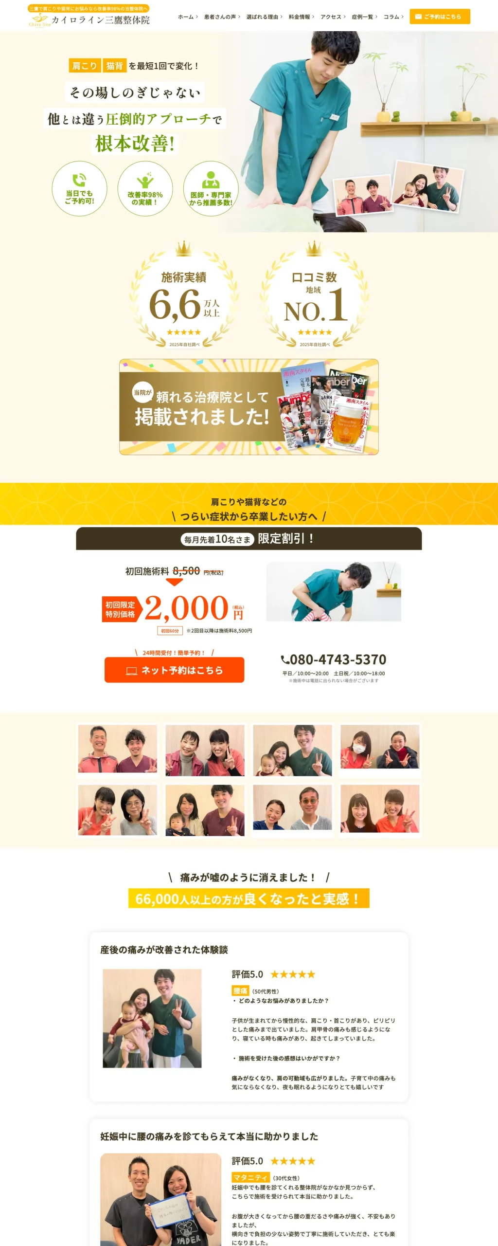 東京都三鷹市の整体院「カイロライン」様の店舗サイト制作。来店予約の導線最適化とスマホファースト設計により、体験コースへの遷移率向上を狙った情報設計とUIを実装しました。