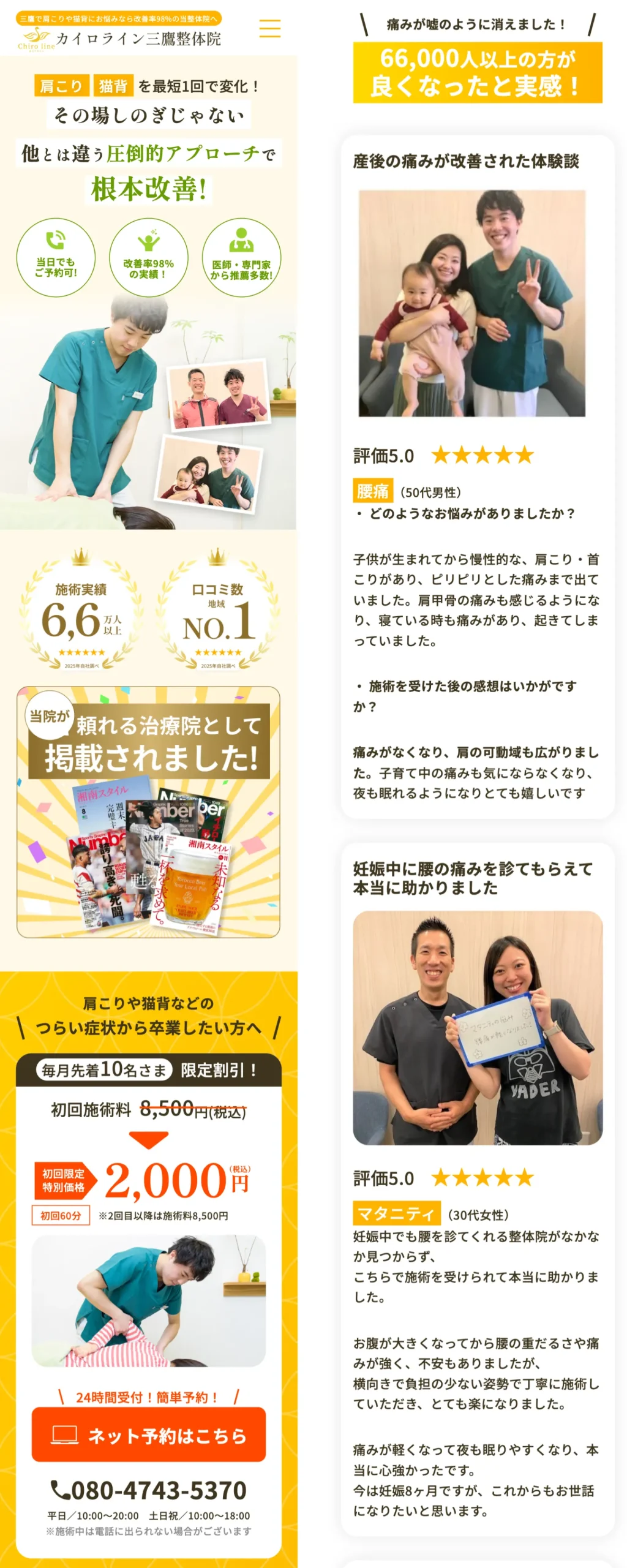 また、これまでカイロライングループとして数多くの患者さんに対してアプローチしてきたエビデンスを訴求としております。 - 予約・来院導線の簡略化