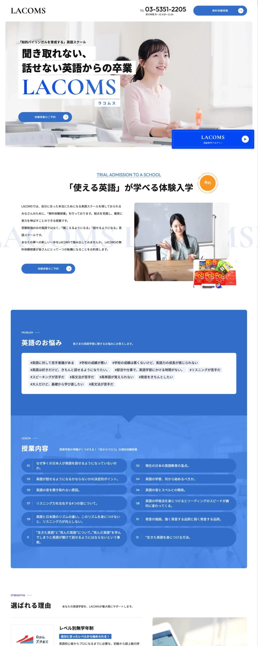 都内で英語塾を運営するクライアント様より、「無料体験授業への申込み数を増やしたい」「教室の強みを分かりやすく伝えたい」とのご相談をいただきました。英語に苦手意識を持つ生徒や、塾選びに悩む保護者の方に対して、教室の指導方針や実績を丁寧に伝えながらも、スムーズに体験申込みまで進められるランディングページをご提案しました。