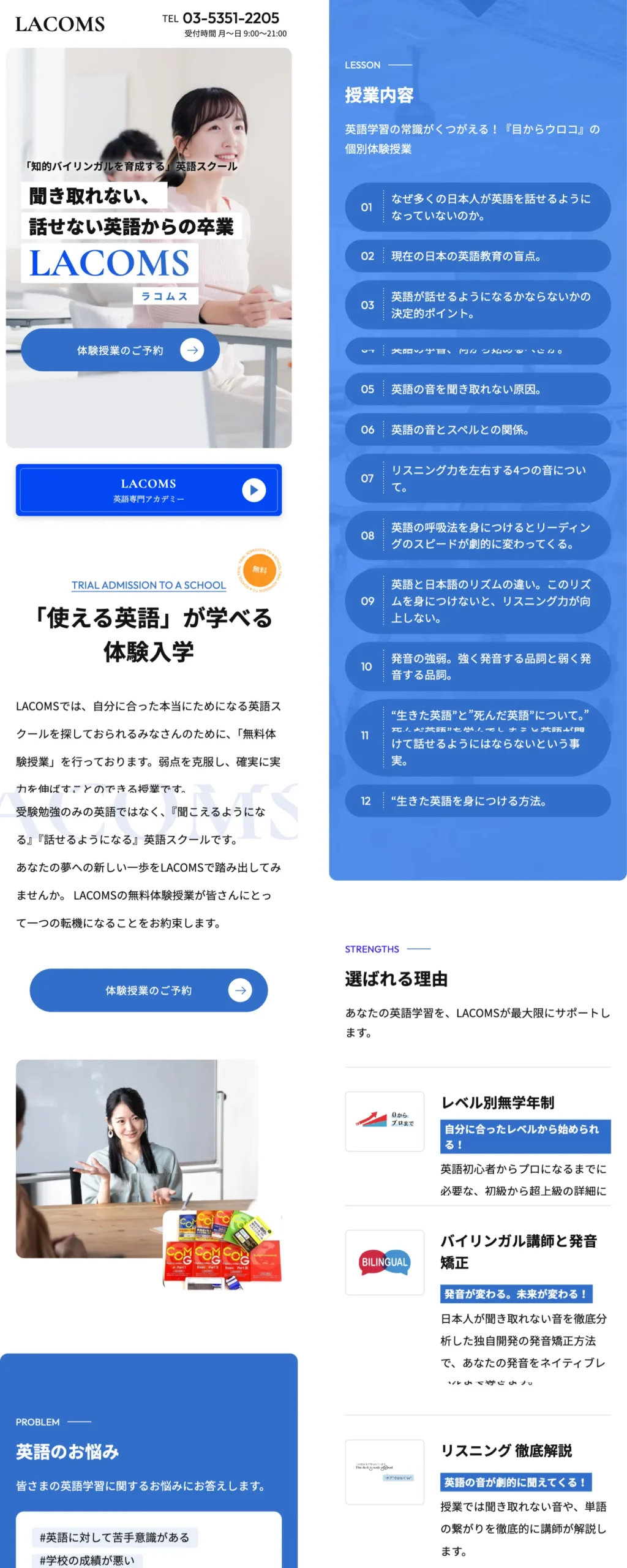 ファーストビューに「無料体験授業のご予約」ボタンを明確に配置し、ページ内の複数箇所から同じ申込みフォームへ遷移できるよう導線を整理しました。スクロールのどの位置からでも、最短2〜3タップで申込み完了まで進められる設計としています。 - 悩み起点のコンテンツ構成