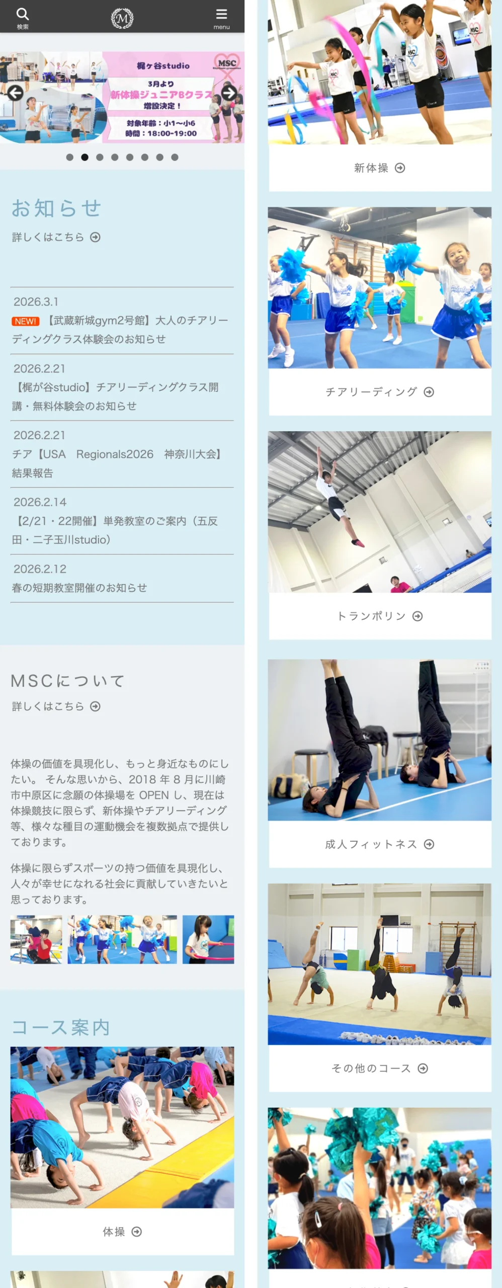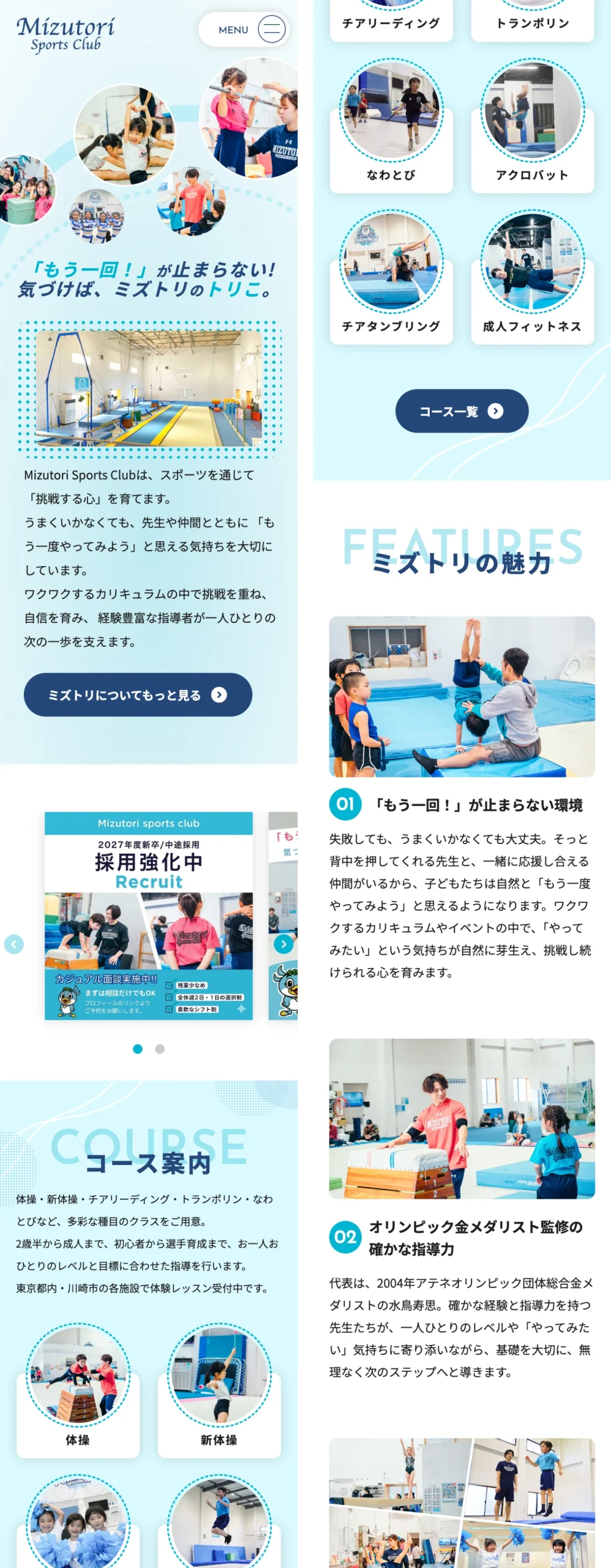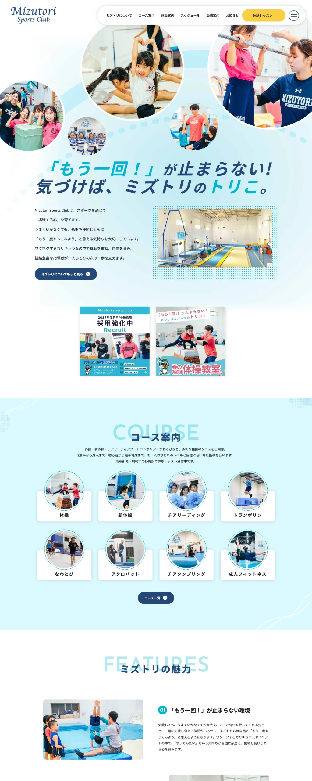 体操・新体操・チアリーディング・トランポリン・なわとび・成人フィットネスなど、多彩なコースそれぞれに専用の詳細ページを用意。各コースの特徴やメリットをアイコン付きで分かりやすく表示し、トレーニング内容をスライダーで紹介することで、入会前にレッスンの雰囲気をイメージできる構成にしました。